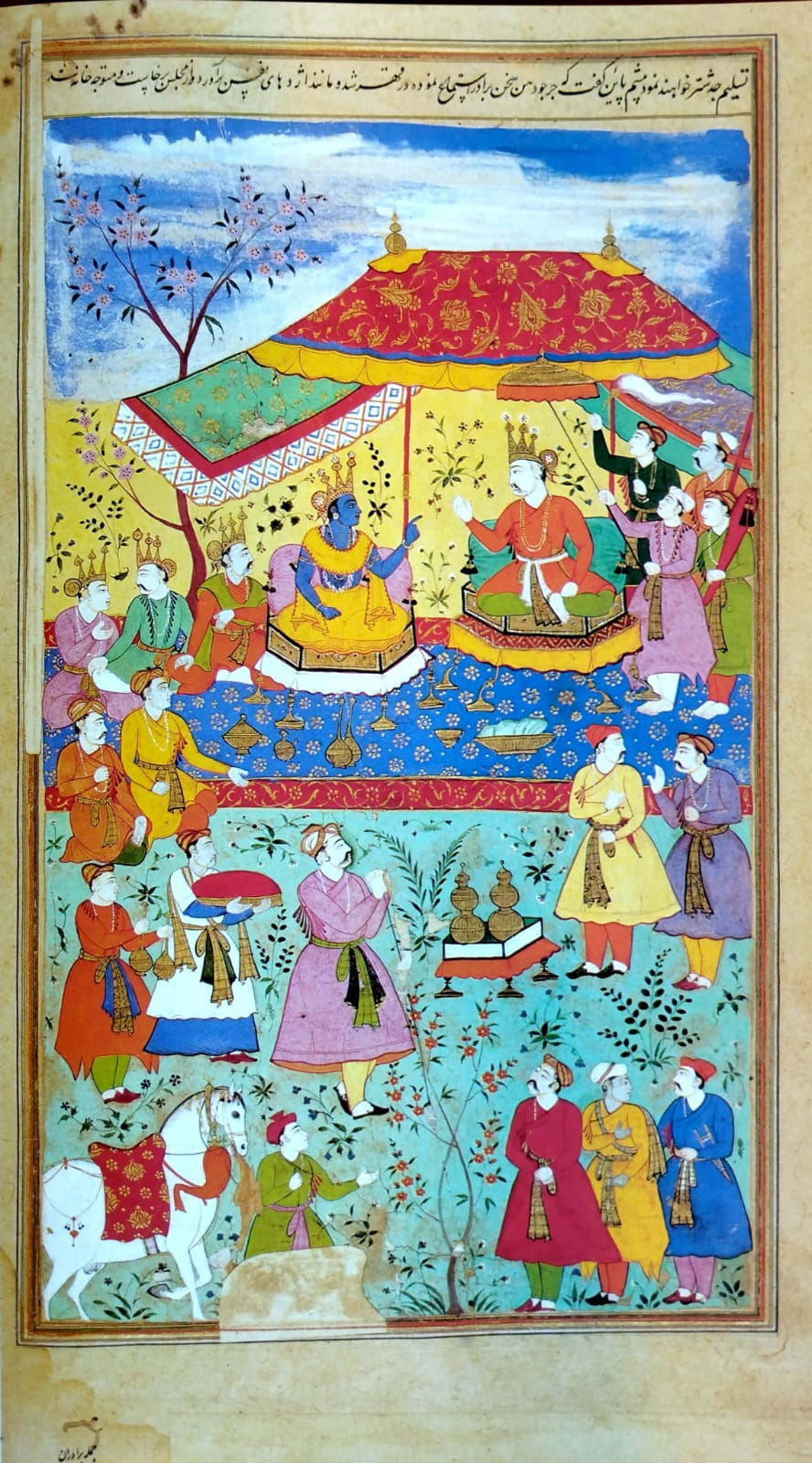 Folio no. 35 illustrates Krishna’s visit to the Kaurava court. In an atmosphere where war appeared inevitable, Krishna conversed with Duryodhana to persuade the Kauravas to give back to the Pandavas their rightful share of the kingdom and ensure peace. Apart from the nobles and courtiers, the painting shows several attendants and retainers, generally present in standard Mughal court scenes. All of them except Krishna are garbed in Mughal court costumes.