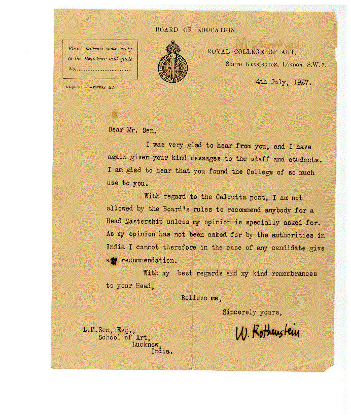 Letter from Professor Rothenstein to LM Sen