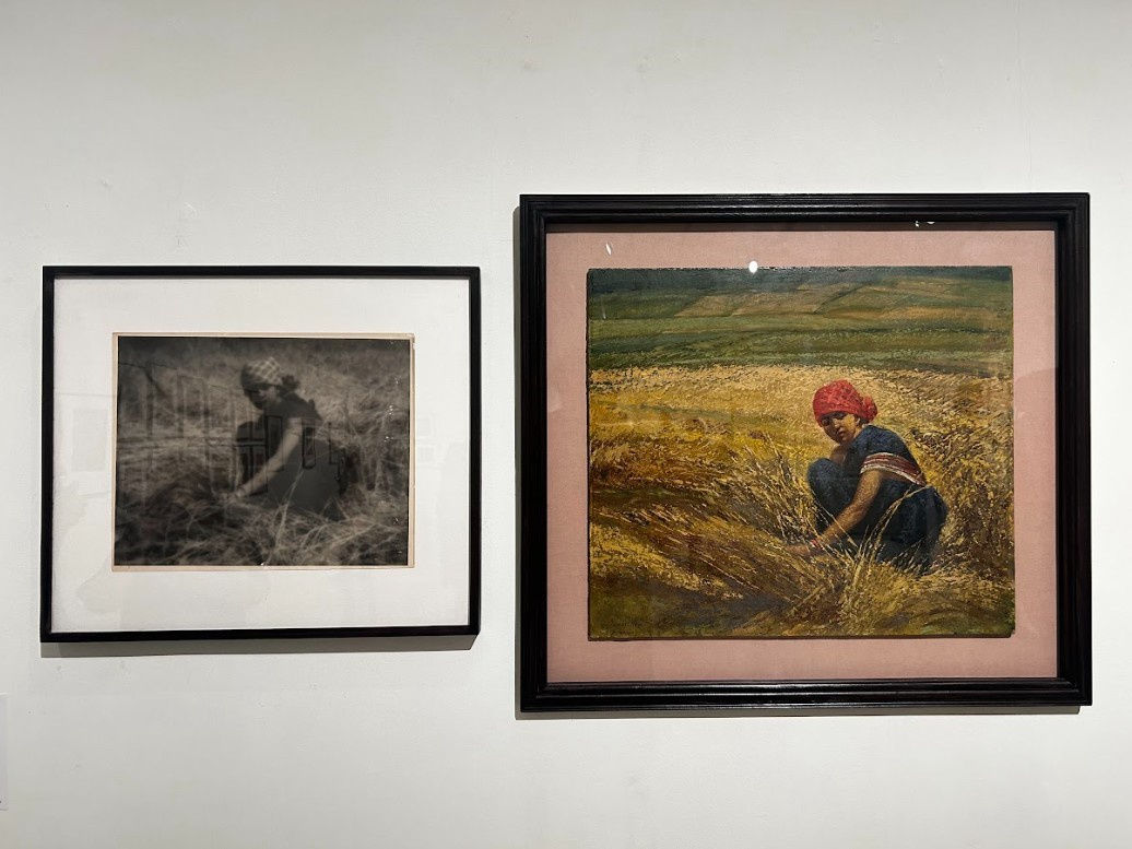 Lalit Mohan Sen understood that the closest a visual artist can come to embodying realism is through the medium of photography. As one saunters through the exhibition, on its walls, one can intermittently notice photographs and the paintings inspired by those photographs juxtaposed. One such vivid example is in an oil painting of a woman harvester and a black and white photograph of the same subject hanging beside each other, clearly evoking two different sensations for the viewer. The painting portrays a bright and sunny day of harvest, with the brush strokes integrating the spirit of an impressionist painting. On the other hand, the photograph brings out the simplicity and softness of a regular day in the pastoral life of a woman harvester, where the absence of colours places more focus on the subject herself.