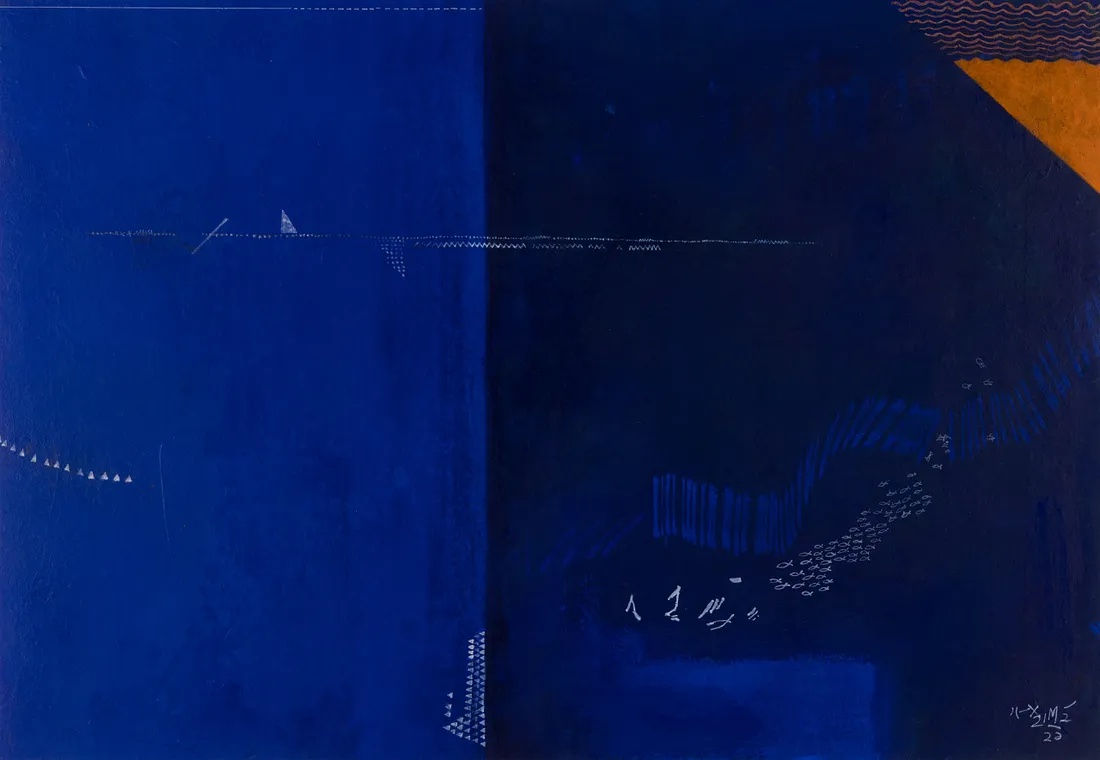 a striking abstraction in blue. Defying the logic of depth, the shade of blue deepens from left to right, and a school of fishes plays in the deep. A trail of white presents a sail with its asymmetrical reflections, and the bright vermilion of the shore in the corner cuts through the blue. Once again, the image suggests clear separations, but “the blue is wideness”, and spreads across all, immersing us in the unpartable body of water.