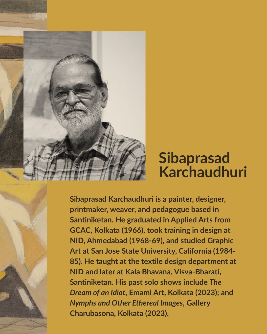 Sibaprasad Karchaudhuri is a painter, designer, printmaker, weaver, and pedagogue based in Santiniketan. He graduated in Applied Arts from GCAC, Kolkata (1966), took training in design at NID, Ahmedabad (1968-69), and studied Graphic Art at San Jose State University, California (1984-85). He taught at the textile design department at NID and later at Kala Bhavana, Visva-Bharati, Santiniketan. His past solo shows include The Dream of an Idiot, Emami Art, Kolkata (2023); and Nymphs and Other Ethereal Images, Gallery Charubasona, Kolkata (2023).