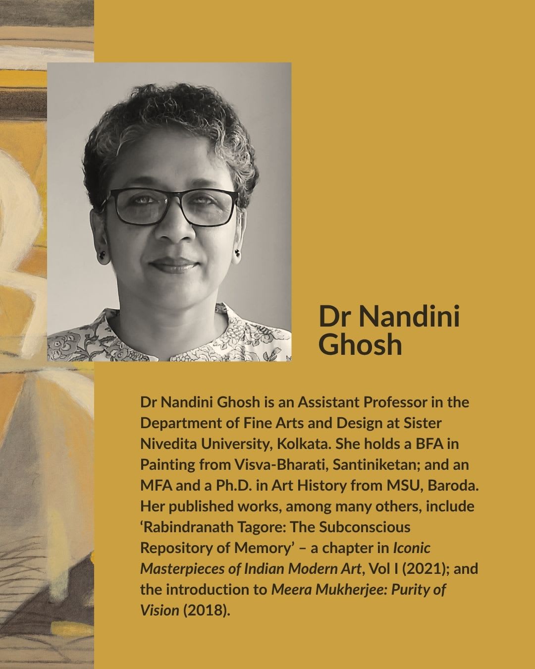 Dr Nandini Ghosh is an Assistant Professor in the Department of Fine Arts and Design at Sister Nivedita University, Kolkata. She holds a BFA in Painting from Visva-Bharati, Santiniketan; and an MFA and a Ph.D. in Art History from MSU, Baroda. Her published works, among many others, include ‘Rabindranath Tagore: The Subconscious Repository of Memory’ – a chapter in Iconic Masterpieces of Indian Modern Art, Vol I (2021); and the introduction to Meera Mukherjee: Purity of Vision (2018).