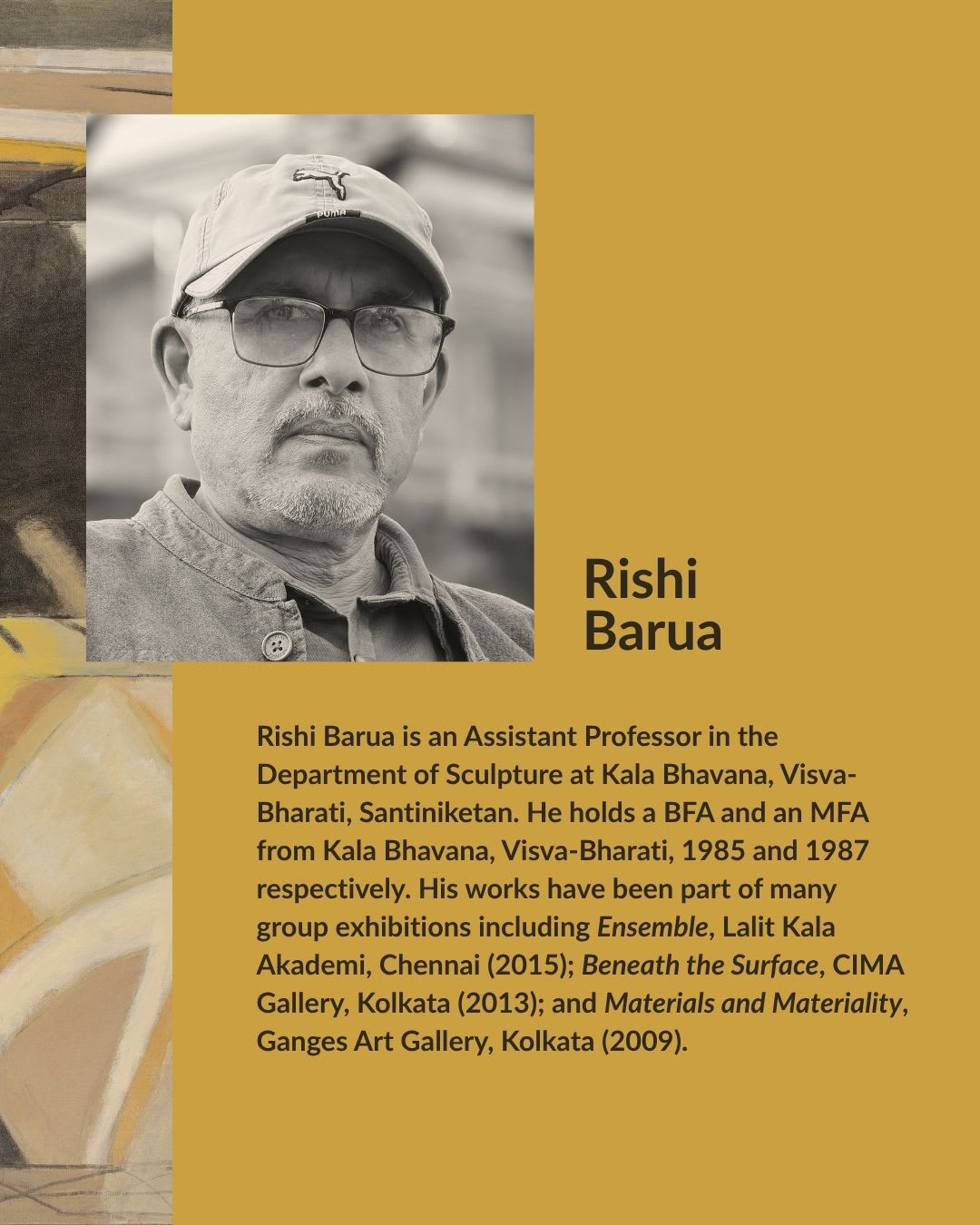 Rishi Barua is an Assistant Professor in the Department of Sculpture at Kala Bhavana, Visva-Bharati, Santiniketan. He holds a BFA and an MFA from Kala Bhavana, Visva-Bharati, 1985 and 1987 respectively. His works have been part of many group exhibitions including Ensemble, Lalit Kala Akademi, Chennai (2015); Beneath the Surface, CIMA Gallery, Kolkata (2013); and Materials and Materiality, Ganges Art Gallery, Kolkata (2009).